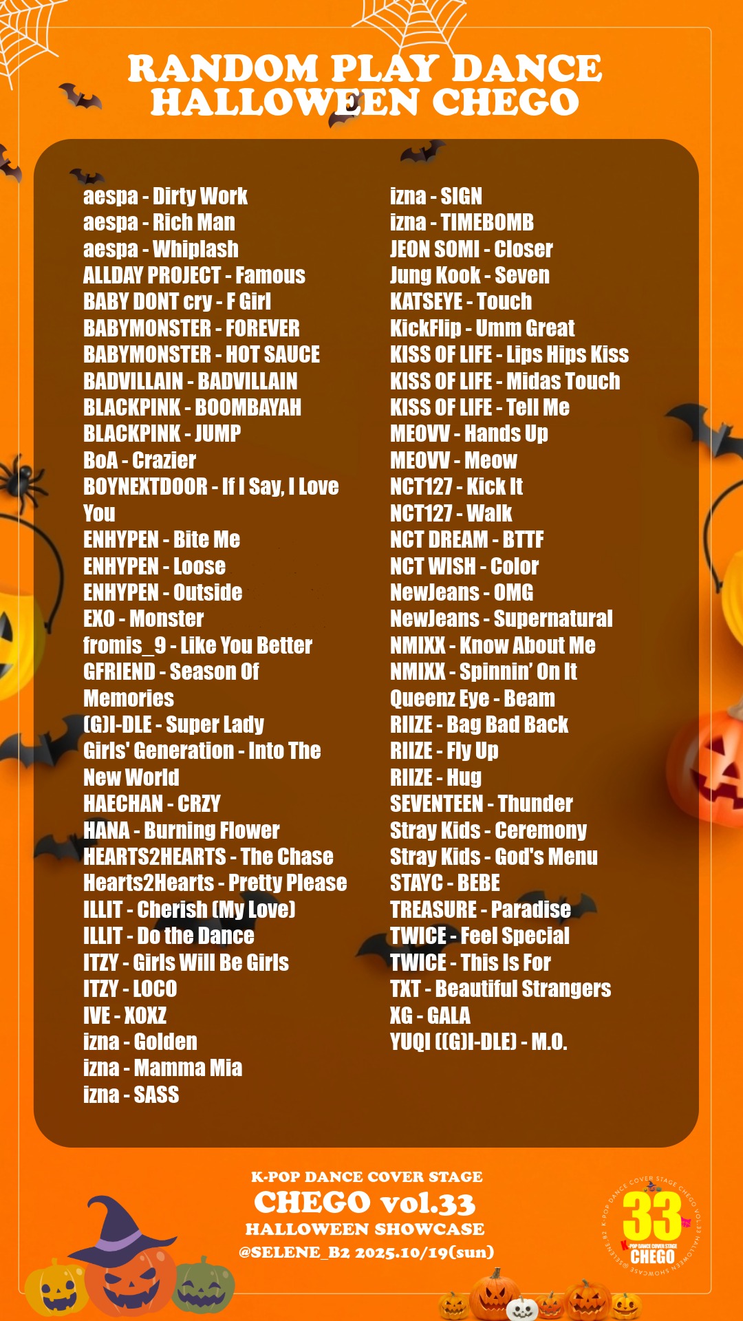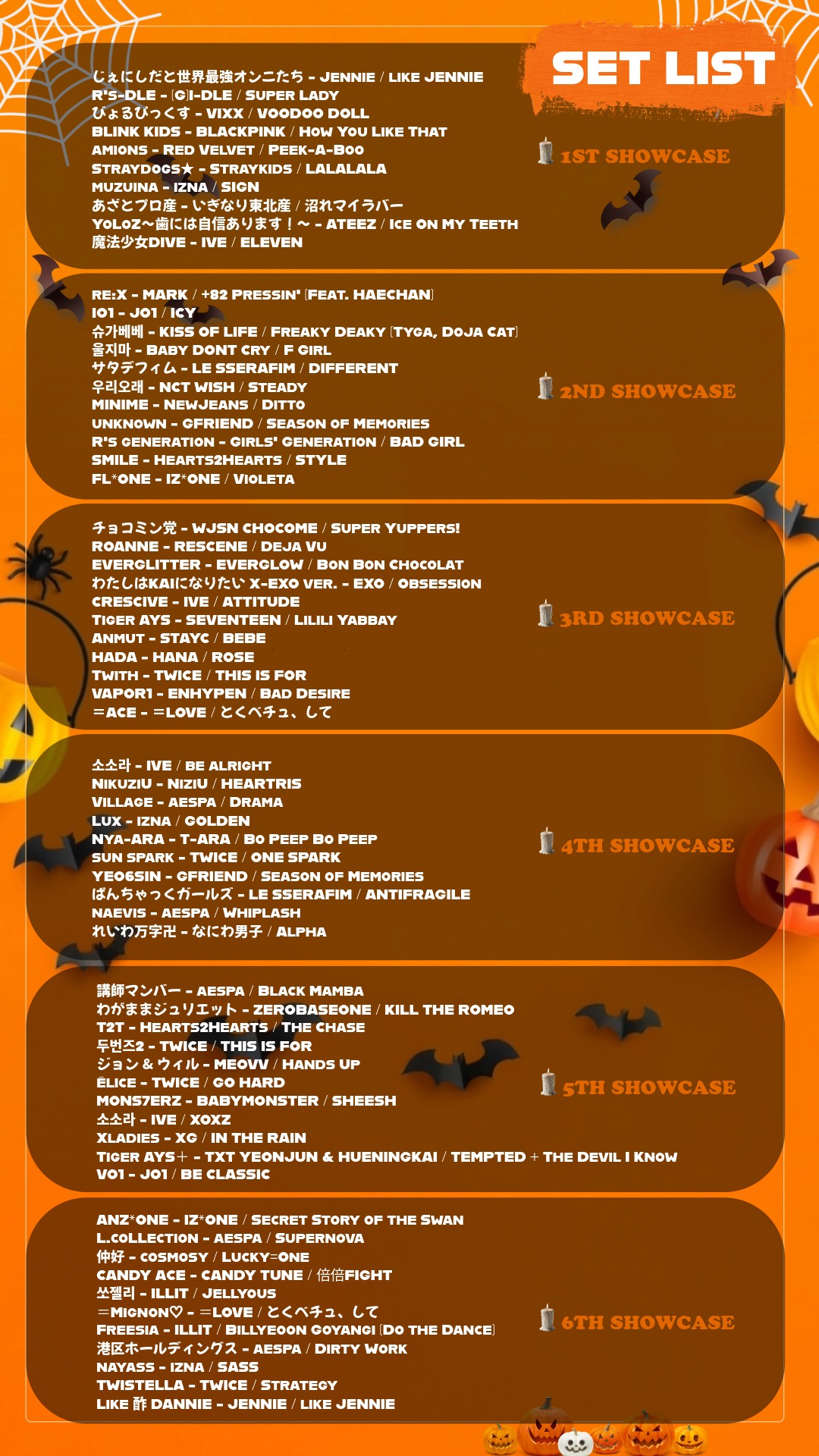 ◆1ST SHOWCASE じぇにしだと世界最強オンニたち - Jennie / like JENNIE R's-DLE - (G)I-DLE / Super Lady びょるぴっくす - VIXX / VOODOO DOLL BLINK KIDS - BLACKPINK / How You Like That amions - Red Velvet / Peek-A-Boo Straydogs★ - Straykids / LALALALA muzuina - izna / SIGN あざとプロ産 - いぎなり東北産 / 沼れマイラバー YoLoZ〜歯には自信あります!〜 - ATEEZ / Ice On My Teeth 魔法少女DIVE - IVE / ELEVEN ◆2ND SHOWCASE re:X - MARK / +82 Pressin' (Feat. HAECHAN) IO1 - JO1 / ICY 슈가베베 - KISS OF LIFE / Freaky Deaky (Tyga, Doja Cat) 울지마 - Baby DONT Cry / F Girl サタデフィム - LE SSERAFIM / DIFFERENT 우리오래 - NCT WISH / Steady MINIME - NewJeans / Ditto unknown - GFRIEND / Season of Memories R's generation - 少女時代 / BAD GIRL SMILE - Hearts2Hearts / STYLE FL*ONE - IZ*ONE / Violeta ◆3RD SHOWCASE チョコミン党 - WJSN CHOCOME / Super Yuppers! ROANNE - RESCENE / Deja Vu EVERGLITTER - EVERGLOW / Bon Bon Chocolat わたしはKAIになりたい X-EXO ver. - EXO / Obsession CRESCIVE - IVE / ATTITUDE Tiger AYS - SEVENTEEN / Lilili Yabbay Anmut - STAYC / BEBE HADA - HANA / ROSE Twith - TWICE / THIS IS FOR VAPOR1 - ENHYPEN / Bad Desire =ACE - =LOVE / とくべチュ、して ◆4TH SHOWCASE 소소라 - IVE / be alright NikuziU - NiziU / HEARTRIS Village - aespa / Drama Lux - izna / GOLDEN Nya-ARA - T-ARA / Bo Peep Bo Peep sun spark - TWICE / ONE SPARK YEO6SIN - GFRIEND / Season of Memories ぱんちゃっくガールズ - LE SSERAFIM / ANTIFRAGILE naevis - aespa / Whiplash れいわ万字卍 - なにわ男子 / Alpha ◆5TH SHOWCASE 講師マンバー - aespa / Black Mamba わがままジュリエット - ZEROBASEONE / KILL THE ROMEO T2T - Hearts2Hearts / The Chase 두번즈2 - TWICE / THIS IS FOR ジョン&ウィル - MEOVV / Hands Up élice - TWICE / GO HARD MONS7ERZ - BABYMONSTER / SHEESH 소소라 - IVE / XOXZ Xladies - XG / IN THE RAIN Tiger AYS+ - TXT YEONJUN & HUENINGKAI / TEMPTED + The Devil I Know VO1 - JO1 / BE CLASSIC ◆6TH SHOWCASE ANZ*ONE - IZ*ONE / Secret Story of the Swan L.coLLection - aespa / Supernova 仲好 - cosmosy / Lucky=One CANDY ACE - CANDY TUNE / 倍倍FIGHT 쏘젤리 - ILLIT / Jellyous =Mignon♡ - =LOVE / とくべチュ、して Freesia - ILLIT / Billyeoon Goyangi (Do the Dance) 港区ホールディングス - aespa / Dirty Work nayass - izna / SASS TWISTELLA - TWICE / Strategy Like 酢 DANNIE - JENNIE / like JENNIE ◆RANDOM PLAY DANCE