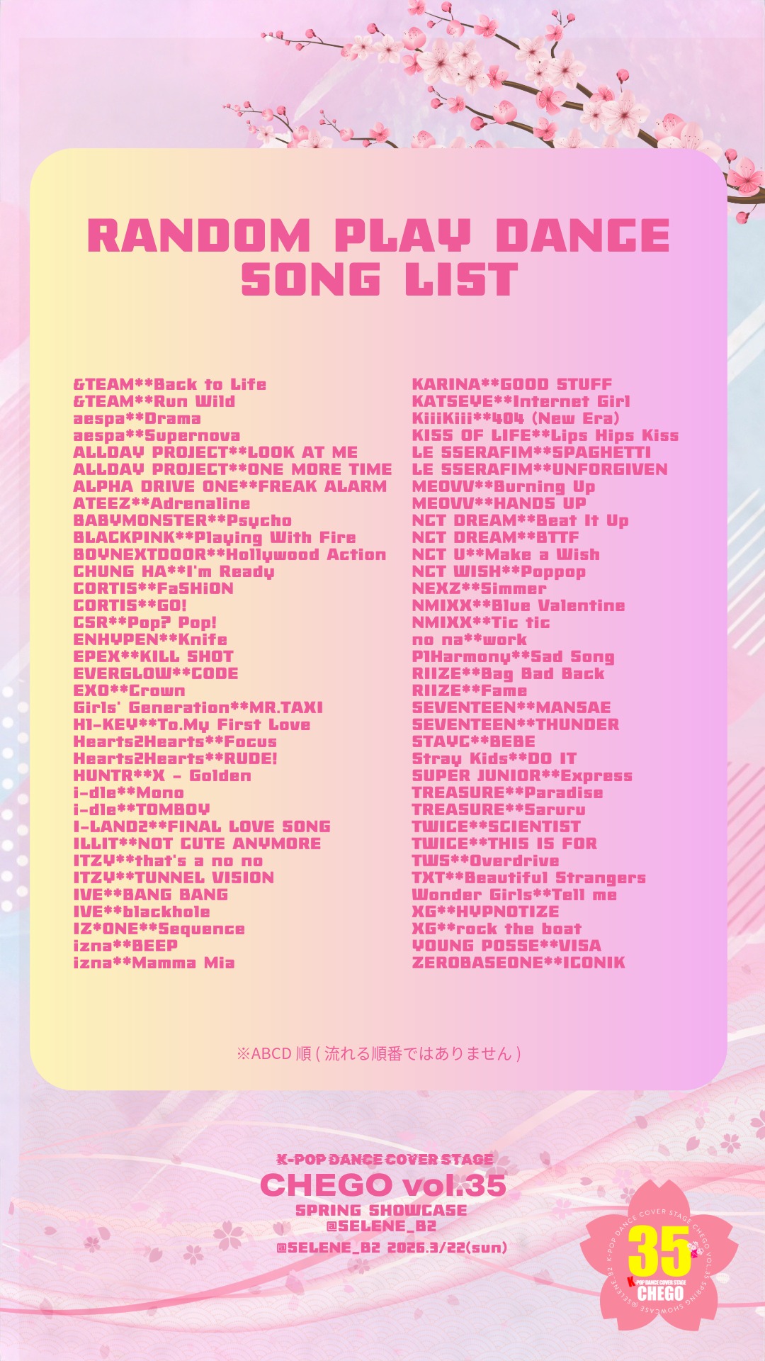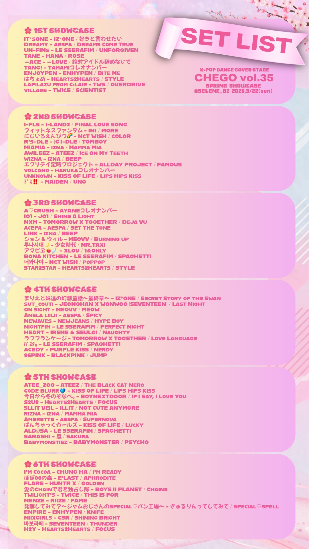 ◆1ST SHOWCASE IT*sONE - IZ*ONE / 好きと言わせたい Dreamy - aespa / Dreams Come True UN-FIMs - LE SSERAFIM / UNFORGIVEN TANE - HANA / ROSE =ACE - =LOVE / 絶対アイドル辞めないで TANG! - Tamamiコレオナンバー ENJOYPEN - ENHYPEN / Bite Me はちょめ - Hearts2Hearts / STYLE Lapilazu from C:lair - TWS / OVERDRIVE village - TWICE / SCIENTIST ◆2ND SHOWCASE I-FLS - I-LAND2 / FINAL LOVE SONG フィットネスファンダム - INI / MORE にじいろえんぴつ🌈 - NCT WISH / COLOR R's-DLE - (G)I-DLE / TOMBOY M!AM!A - izna / Mamma Mia AWILEEZ - ATEEZ / Ice On My Teeth wizna - izna / BEEP エブリデイ定時プロジェクト - ALLDAY PROJECT / FAMOUS volcano - harukaコレオナンバー unknown - KISS OF LIFE / Lips Hips Kiss ドス‼️ - MAIDEN / UNO ◆3RD SHOWCASE A♡CRUSH - AYANEコレオナンバー IO1 - JO1 / Shine A Light NXM - TOMORROW X TOGETHER / Deja Vu acepa - aespa / Set The Tone L!NK - izna / BEEP ジョン&ウィル - MEOVV / Burning Up 루나시대🌙 - 少女時代 / MR.TAXI アマビヱ❤️🔥🪽 - XLOV / 1&Only BONA KITCHEN - LE SSERAFIM / SPAGHETTI 너와나야 - NCT WISH / poppop Star2Star - Hearts2Hearts / STYLE ◆4TH SHOWCASE まりえと妹達の幻想童話〜最終章〜 - IZ*ONE / Secret Story of the Swan svt_covti - JEONGHAN X WONWOO (SEVENTEEN) / Last Night On sight - MEOVV / MEOW Anela liilii - aespa / Spicy NeWaves - NewJeans / Hype Boy nightfim - LE SSERAFIM / Perfect Night HEART - IRENE&SEULGI / Naughty ラブブランゲージ - TOMORROW X TOGETHER / Love Language パスタ。 - LE SSERAFIM / SPAGHETTI ACEDY - PURPLE KISS / Nerdy 96PINK - BLACKPINK / JUMP ◆5TH SHOWCASE ATEE_ZOO - ATEEZ / The Black Cat Nero Code Blurr💙 - KISS OF LIFE / Lips Hips Kiss 今日から冬のそなぺ。 - BOYNEXTDOOR / If I Say, I Love You S2U8 - Hearts2Hearts / FOCUS 5LLIT Veil - ILLIT / NOT CUTE ANYMORE rizna - izna / Mamma Mia Ambrette - aespa / Supernova ぱんちゃっくガールズ - KISS OF LIFE / Lucky ALDØSA - LE SSERAFIM / SPAGHETTI SARASHI - 嵐 / Sakura Babymonstiez - BABYMONSTER / PSYCHO ◆6TH SHOWCASE I'm Cocoa - CHUNG HA / I'm Ready ほぼ00の森 - E'LAST / Aphrodite FLARE - HUNTR X / Golden 愛のChainで君を独占し隊 - BOYS Ⅱ PLANET / Chains twilight's - TWICE / THIS IS FOR MENZE - RIIZE / FAME 発酵してみて?〜ジャムおじさんのSpecial♡パン工場〜 - きゅるりんってしてみて / Special♡spell ENPIRE - ENHYPEN / Knife MiixGirls - CSR / Shining Bright 바보라떼 - SEVENTEEN / Thunder H2Y - Hearts2Hearts / FOCUS ◆RANDOM PLAY DANCE